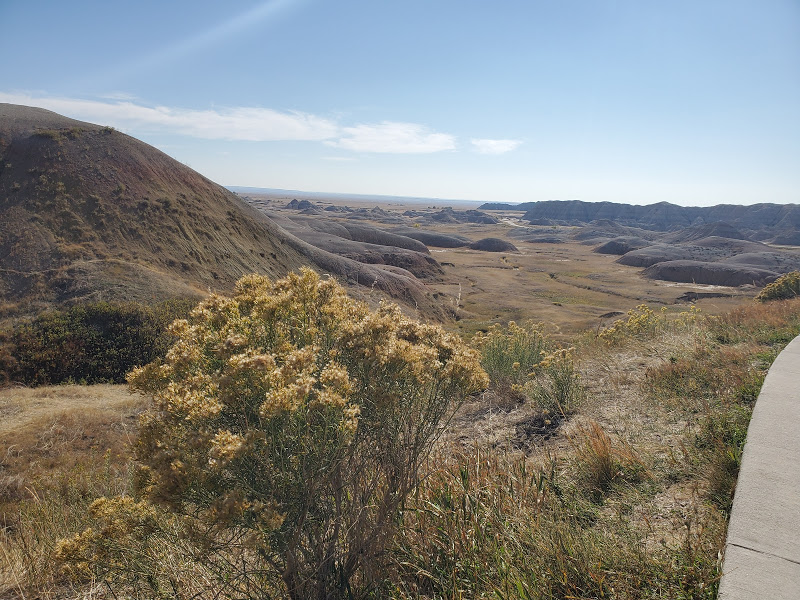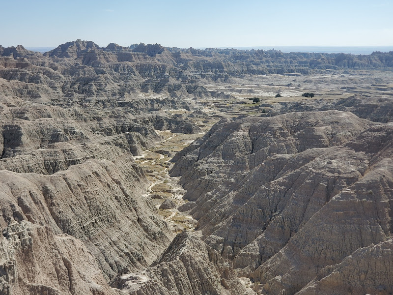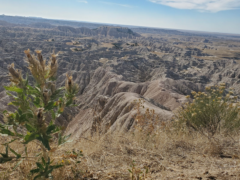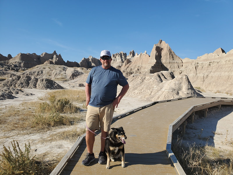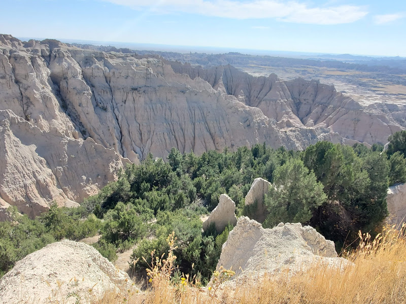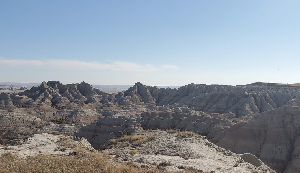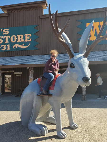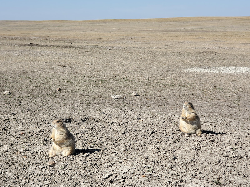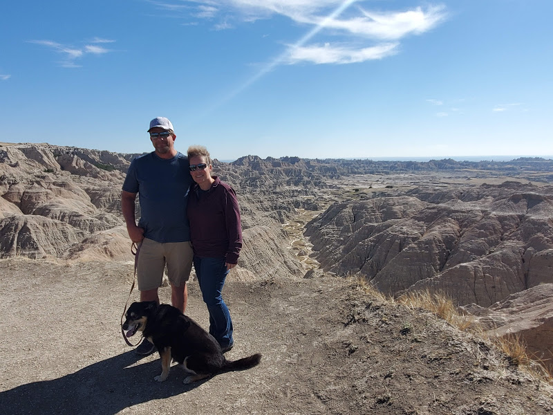 Wall Drug was interesting – I’m amazed at the marketing genius that seems to have built a town around a drug store. It was an eclectic collection of Old West and seemingly anything that someone found interesting, jackalopes, weird carvings, and Jurassic Park, as examples. We headed to the Badlands, which was really interesting because on the north side of the road is flat prairie with the South side dropping sharply to the Badlands geological formations that make up the National Park. The colors within the rock were yellows and reds and not like anything we’d seen before.